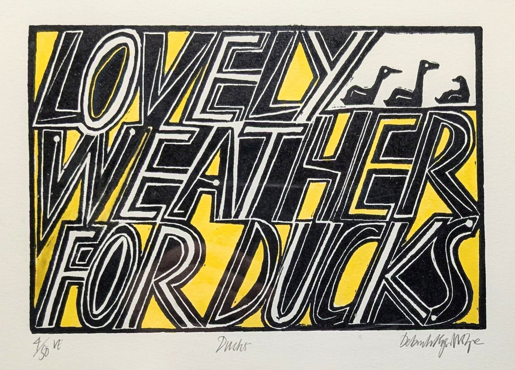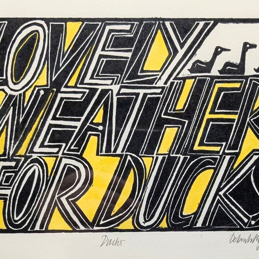 An original lino print by Deborah Hopson-Wolpe framed in slim black frame.